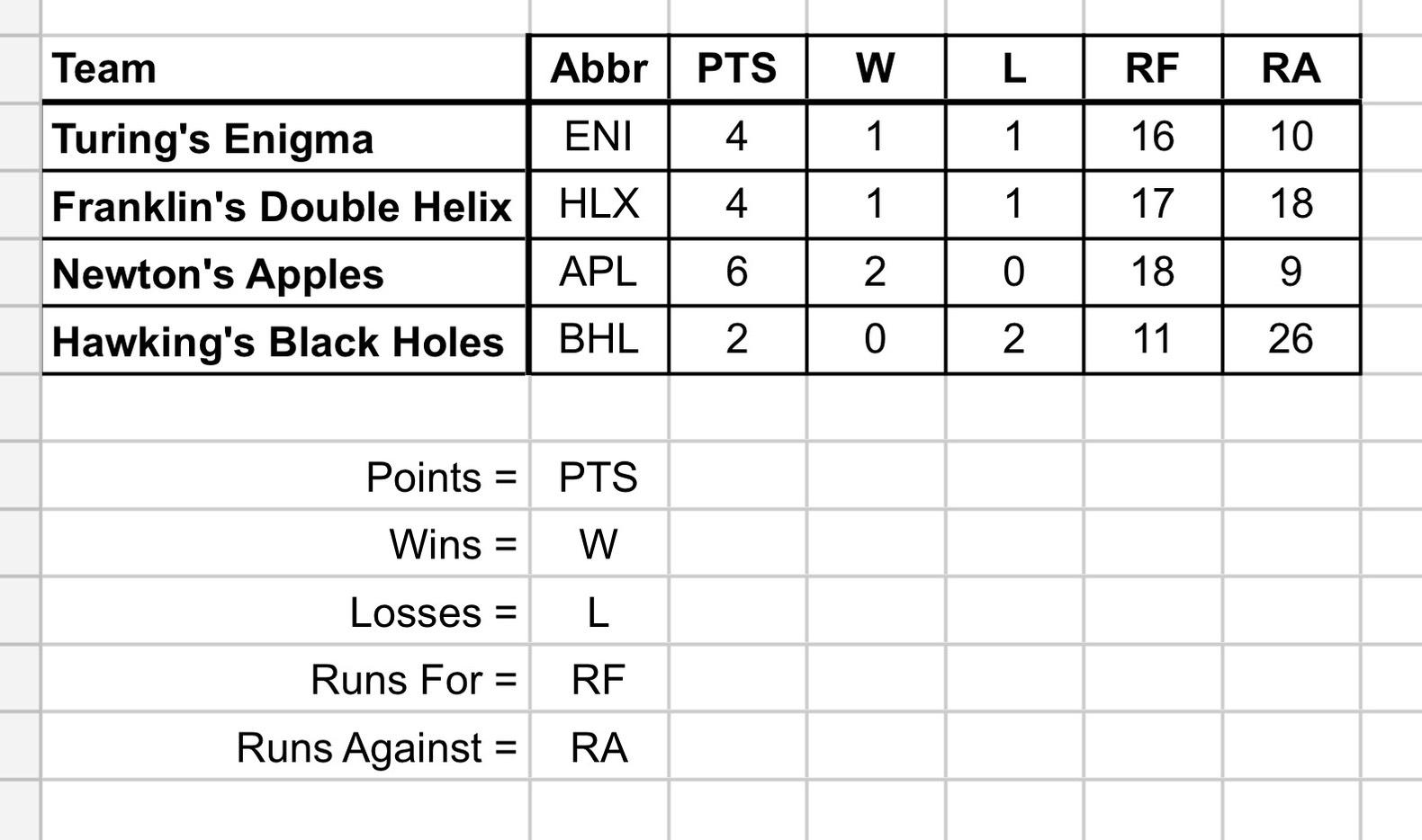 We had a full roster of 4 Teams: Newton’s Apples, Hawking’s Black Holes, Franklin’s Double Helix and Turing’s Enigma, with each team playing two games during the series.
